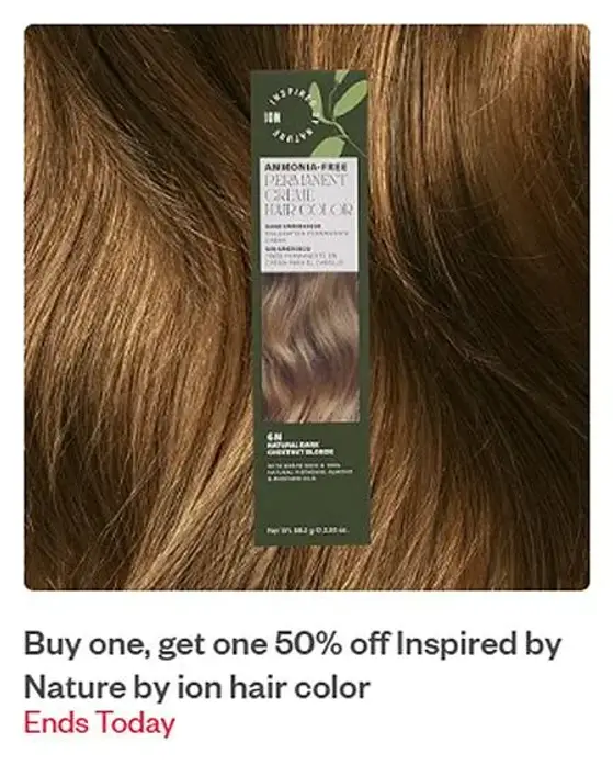 Hurry in and buy one, get one 50% off Inspired by nature by ion hair color in store for a limited time.